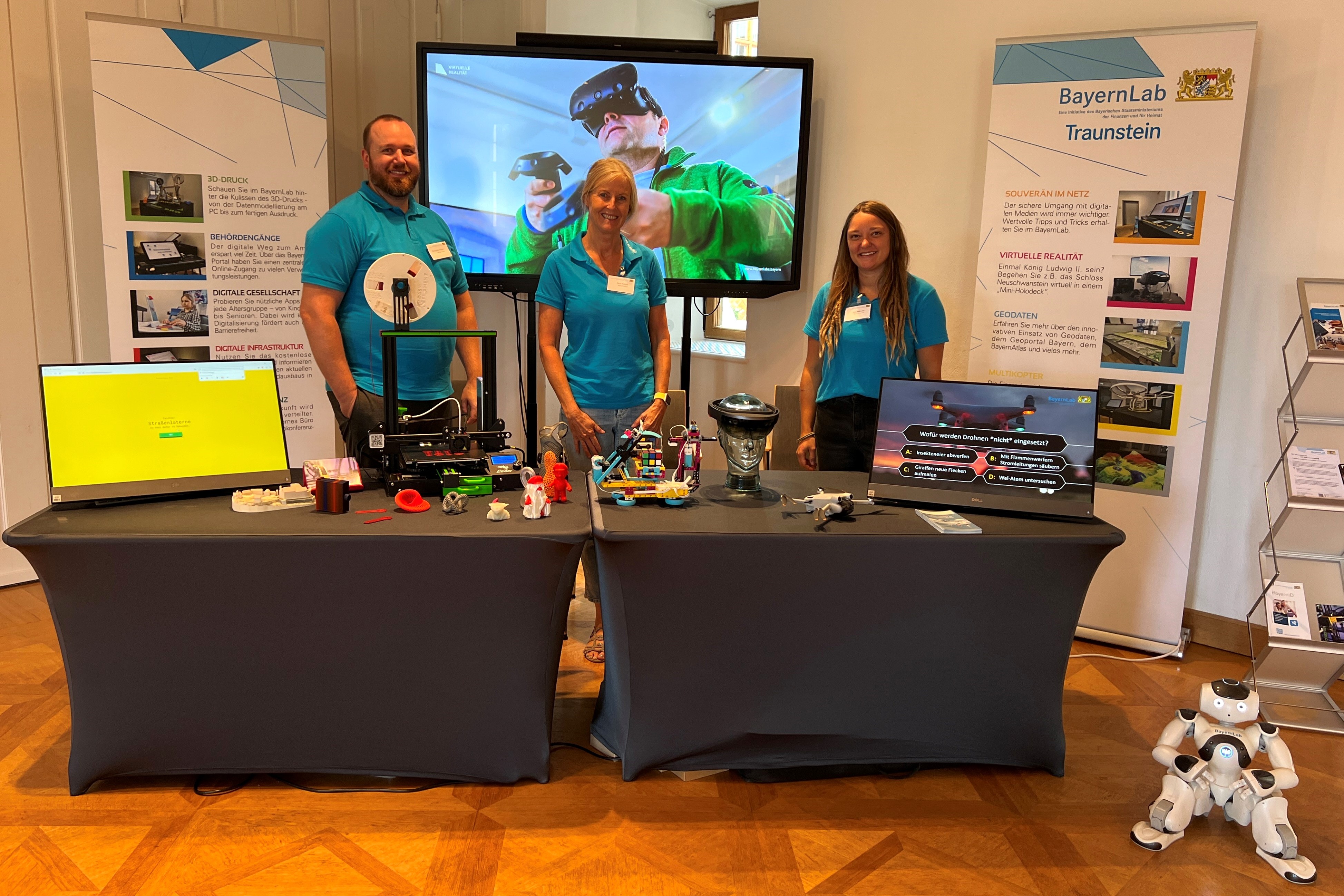 Zwei Frauen und ein Mann vom BayernLab stehen hinter einem Präsentationstisch mit digitalen Exponaten und lächeln in die Kamera. Vorne rechts sitzt ein humanoider Roboter.