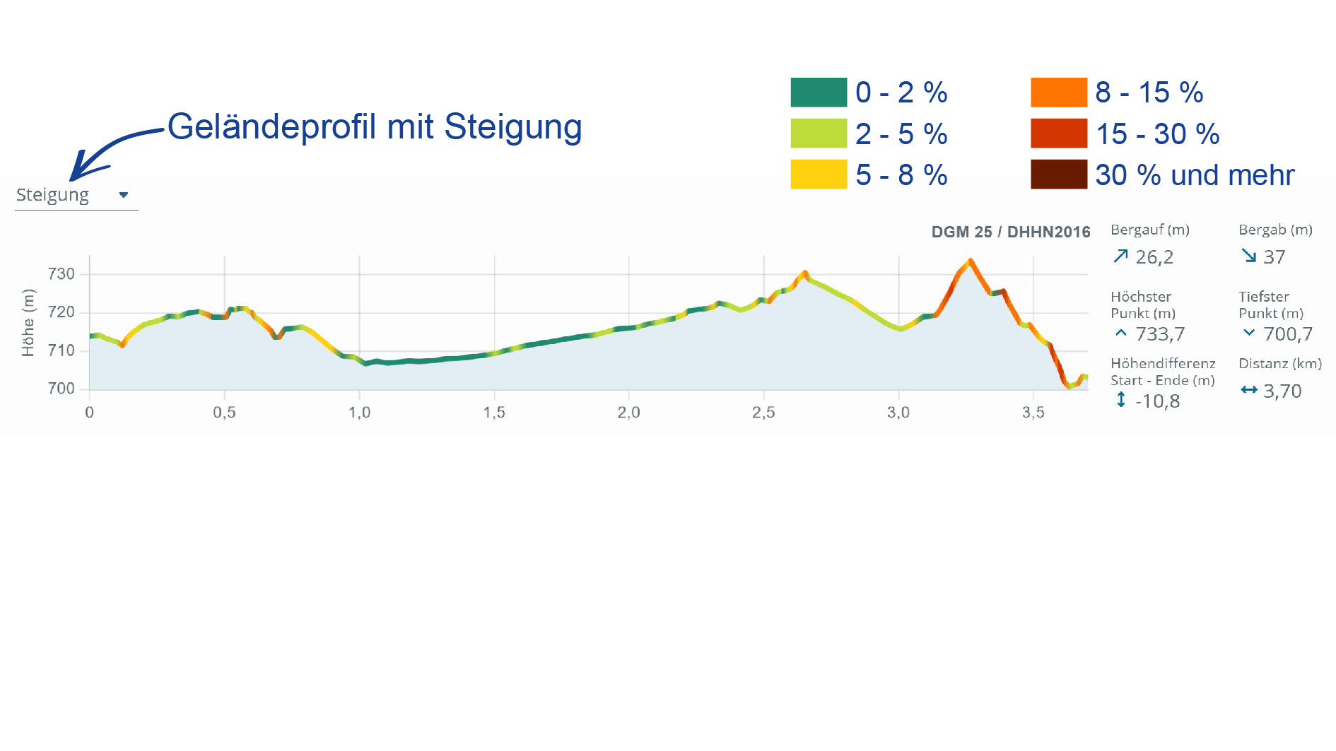 Sobald ein Element gezeichnet wurde, werden unten im Bearbeitungsfenster die Button Zeichnung löschenDaten Teilen und Export eingeblendet. Wurde eine Linie oder ein Polygon gezeichnet steht zusätzlich der Button Geländeprofil (Profil siehe Bild unten) zur Verfügung. Im Geländeprofil wird die Höhe in Metern oder die Steigung in % dargestellt.